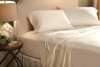 100% Cotton 300 Count. Luxurious sateen weave. Extra-large top sheet. Fits mattresses up to 14" deep. Heavy-duty elastic perimeter for stay-put fit. Include two pillowcases. 1yr warranty.